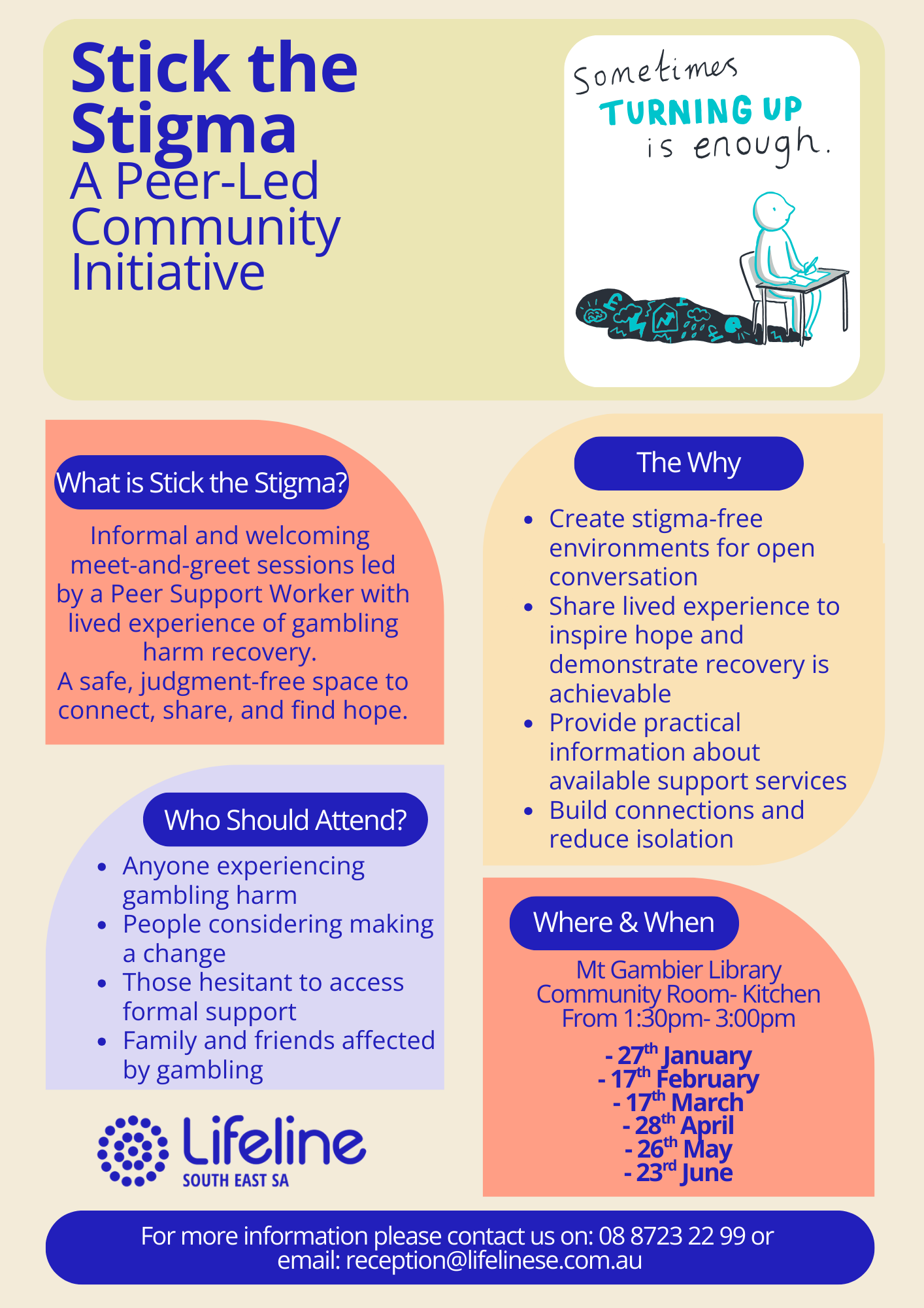 This page is for what we've got on at the moment at Lifeline South East, South Australia.